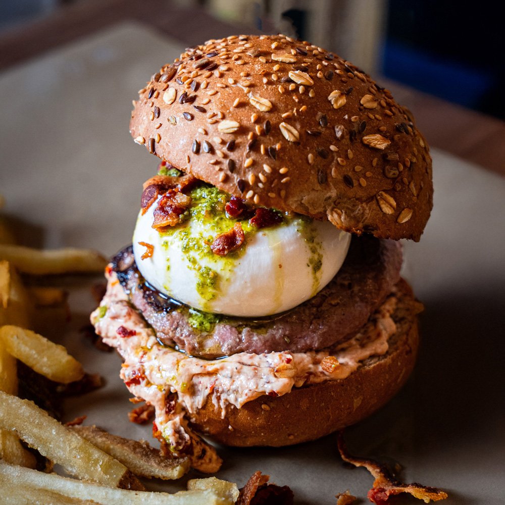 Ingredienti: pane multicereali artigianale, hamburger 100% razza bovina piemontese, mayo homemade ai pomodori secchi e peperoncino, 100g di burrata, pesto fresco al basilico, bacon croccante